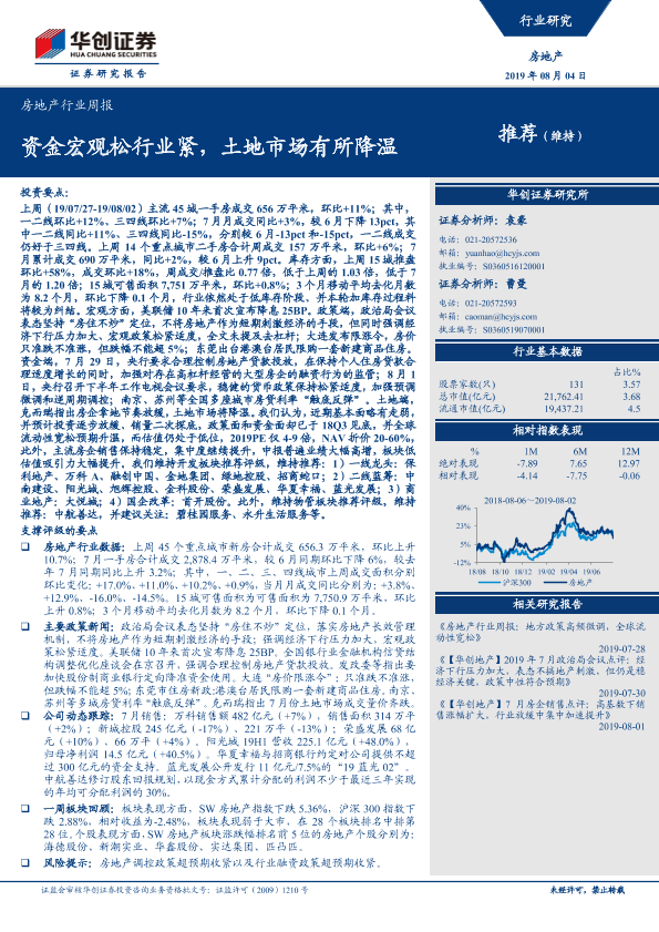 【华创证券】【20190804】房地产行业周报:资金宏观松行业紧,土地市场有所降温-22页