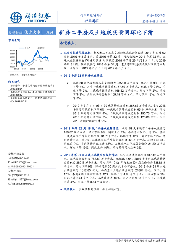 【海通证券】【20190811】房地产行业周报:新房二手房及土地成交量同环比下滑-6页