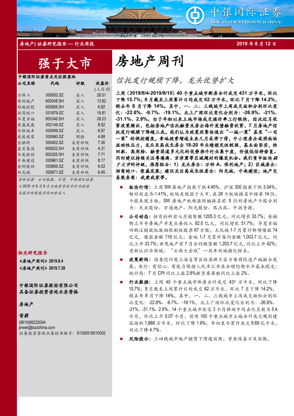 【中银证券】【20190812】房地产周刊:信托发行规模下降,龙头优势扩大-16页