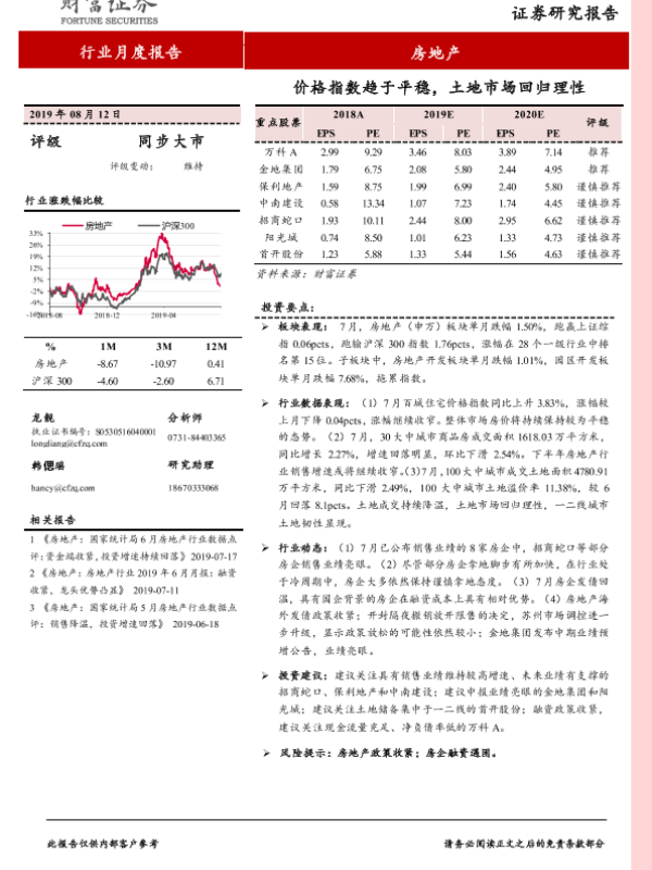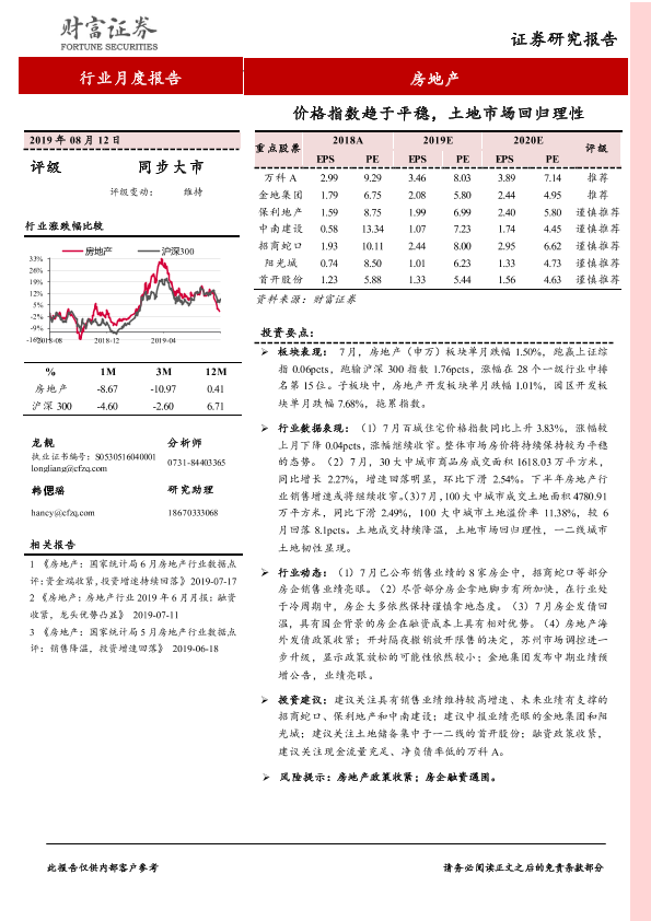 【财信证券】【20190812】房地产行业月度报告:价格指数趋于平稳,土地市场回归理性-14页