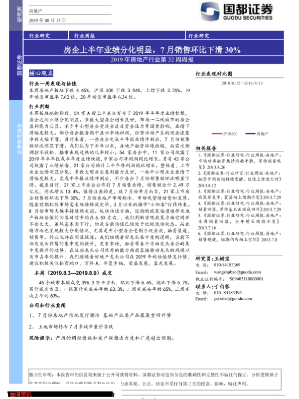 【国都证券】【20190813】2019年房地产行业第32周周报:房企上半年业绩分化明显,7月销售环比下滑30%-18页