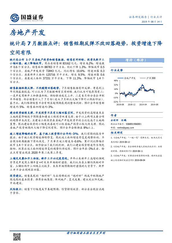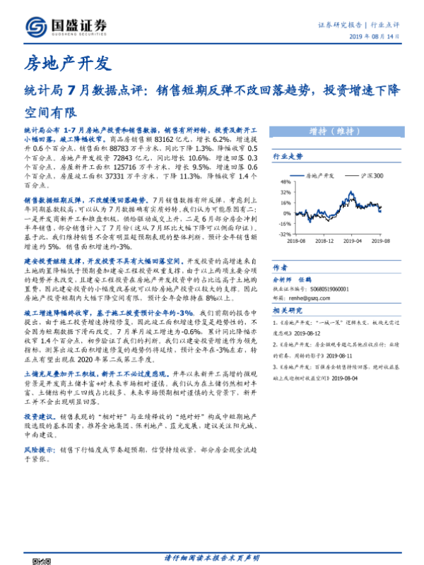 【国盛证券】【20190814】统计局7月数据点评:销售短期反弹不改回落趋势,投资增速下降空间有限-8页