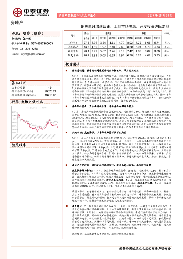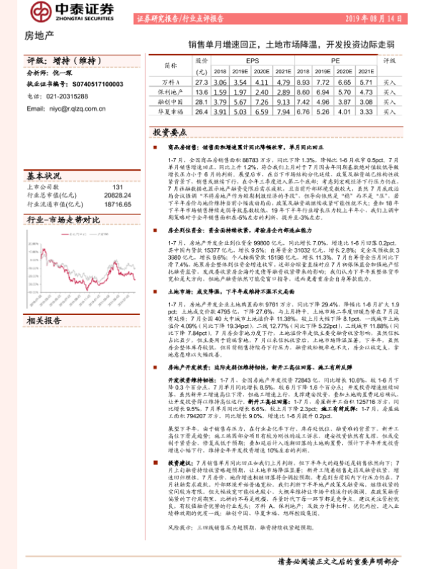 【中泰证券】【20190814】房地产行业点评报告:销售单月增速回正,土地市场降温,开发投资边际走弱-2页