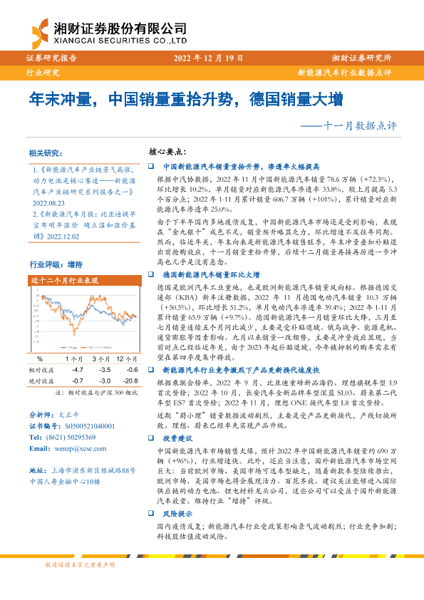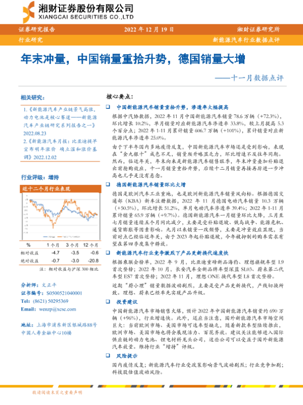 【湘财证券】【20221219】新能源汽车行业数据点评:十一月数据点评,年末冲量,中国销量重拾升势,德国销量大增-18页