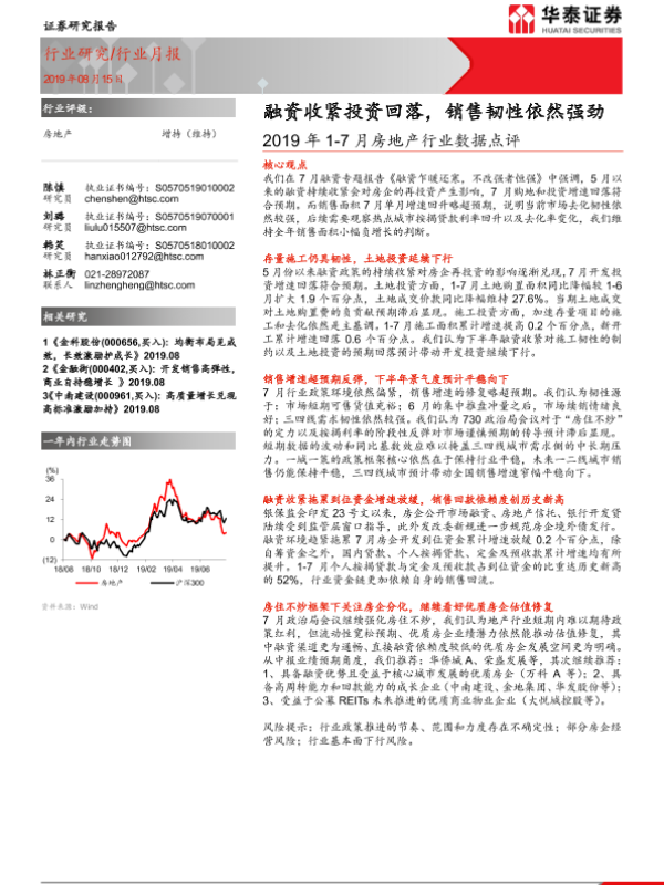 【华泰证券】【20190815】2019年1-7月房地产行业数据点评:融资收紧投资回落,销售韧性依然强劲-12页