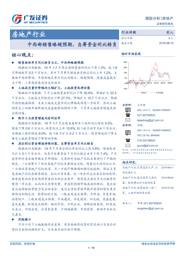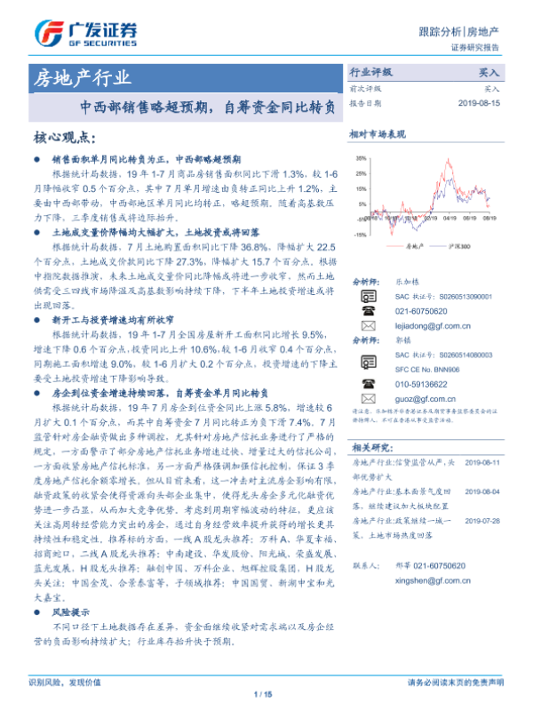 【广发证券】【20190815】房地产行业跟踪分析:中西部销售略超预期,自筹资金同比转负-15页