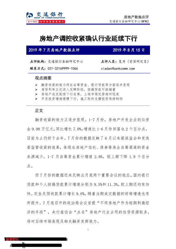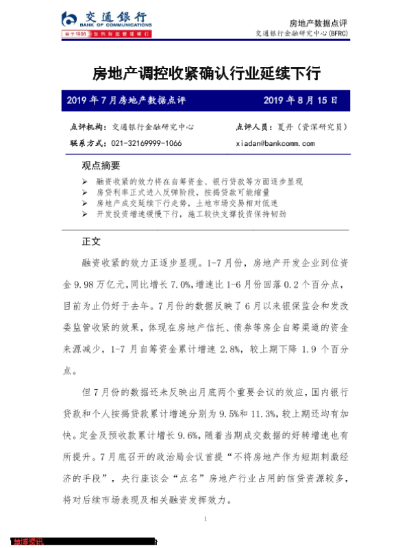 【交通银行金融研究中心】【20190815】2019年7月房地产数据点评-4页