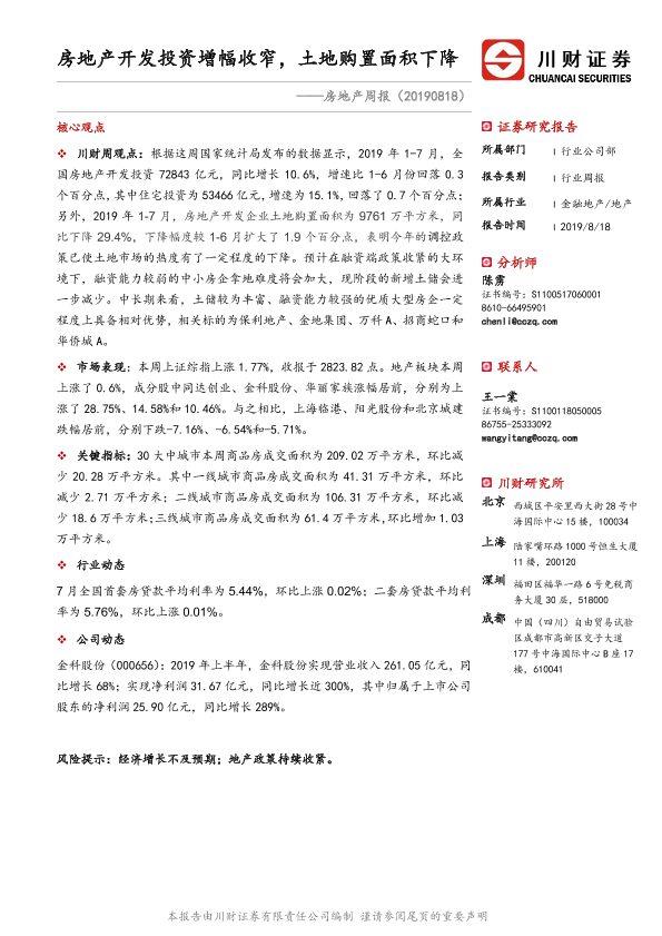 【川财证券】【20190818】房地产开发投资增幅收窄,土地购置面积下降-10页