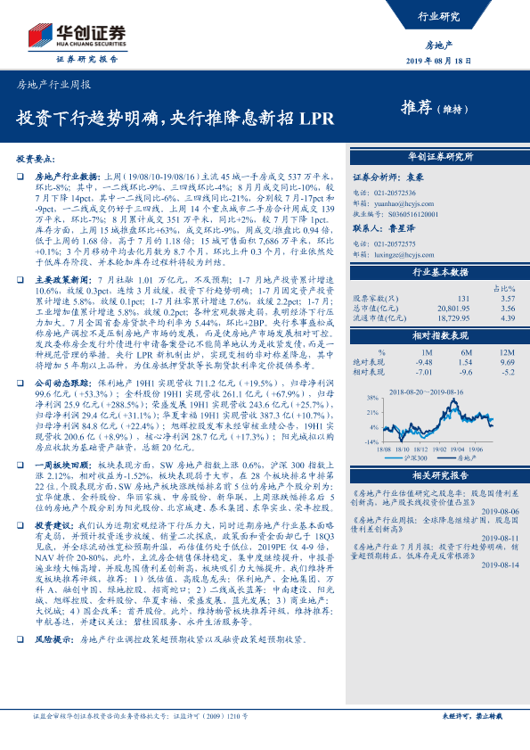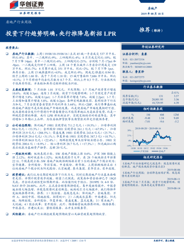 【华创证券】【20190818】房地产行业周报:投资下行趋势明确,央行推降息新招LPR-22页
