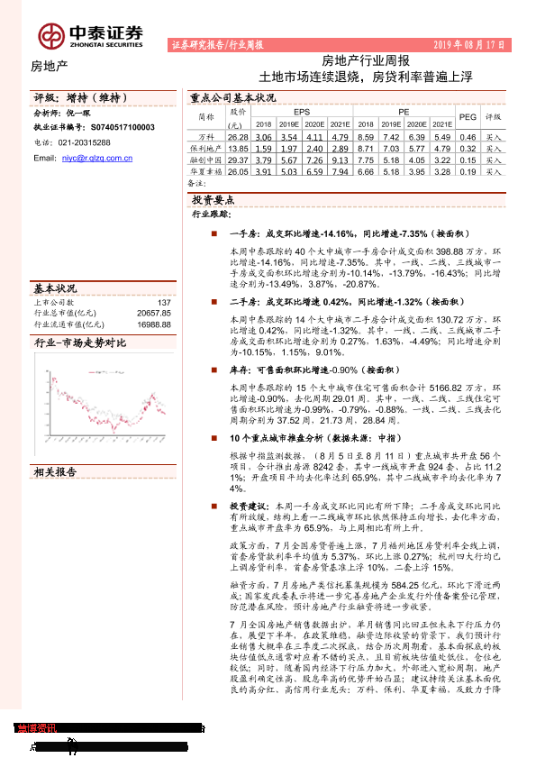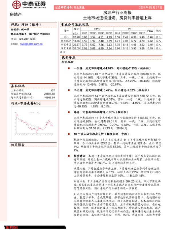 【中泰证券】【20190817】房地产行业周报:土地市场连续退烧,房贷利率普遍上浮-22页