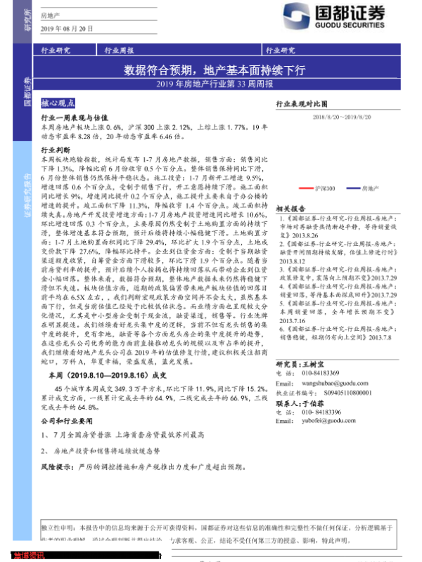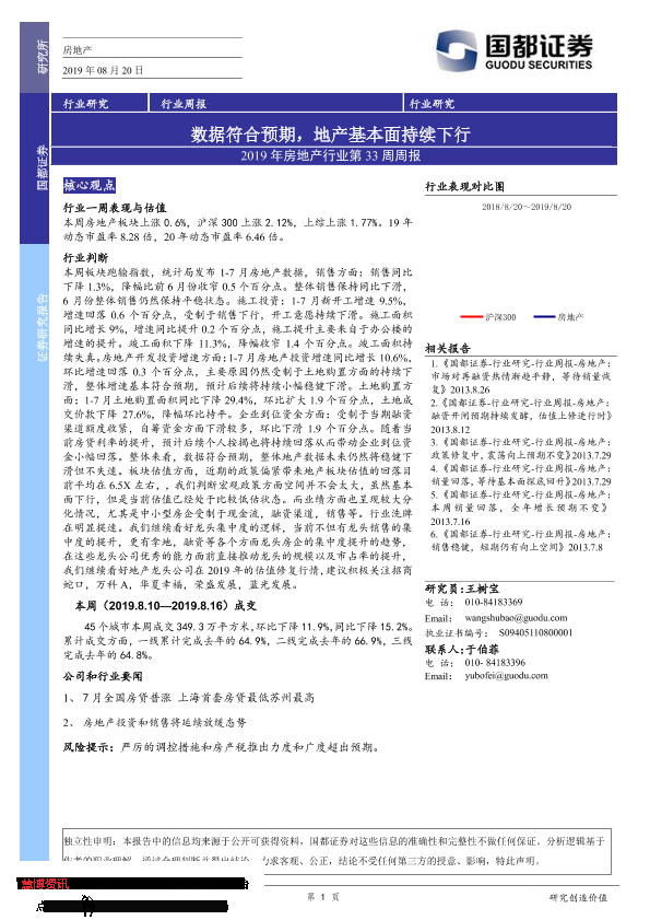 【国都证券】【20190820】2019年房地产行业第33周周报:数据符合预期,地产基本面持续下行-18页