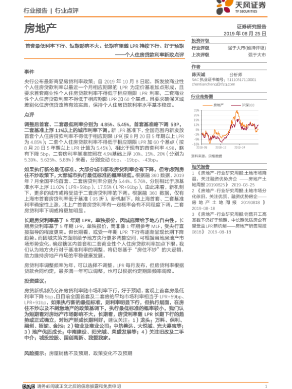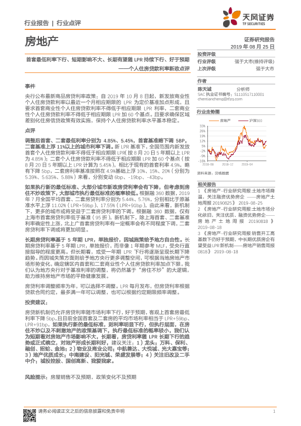 【天风证券】【20190825】个人住房贷款利率新政点评:首套最低利率下行、短期影响不大、长期有望随LPR持续下行、好于预期-4页