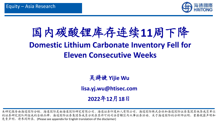 【海通国际】【20221218】有色金属行业:国内碳酸锂库存连续11周下降-28页