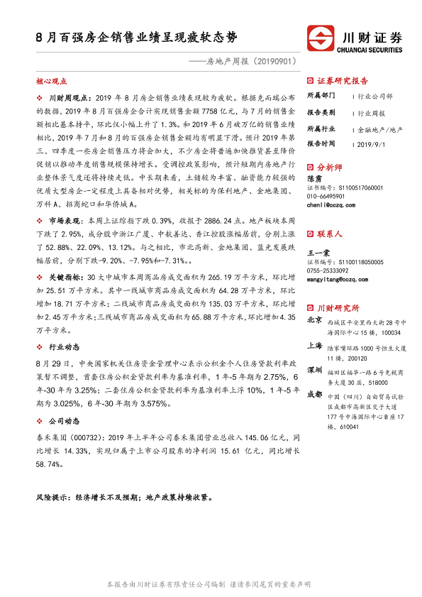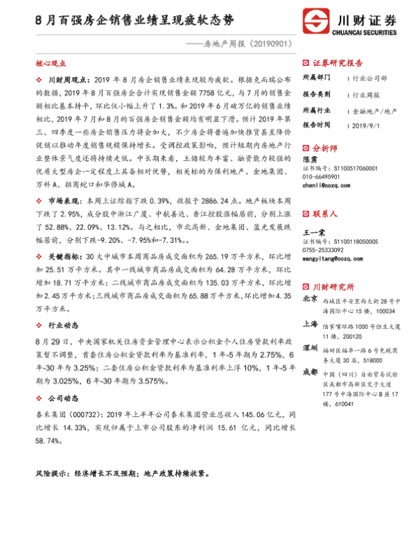 【川财证券】【20190901】8月百强房企销售业绩呈现疲软态势-10页