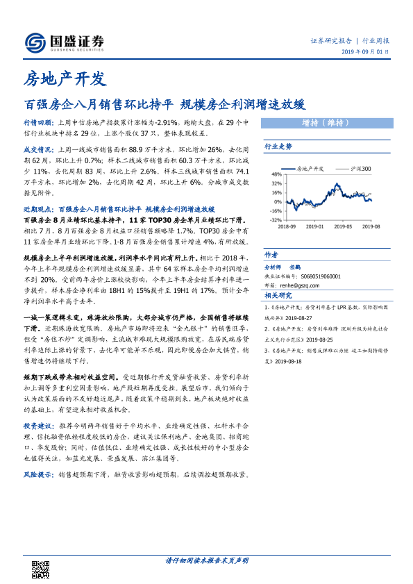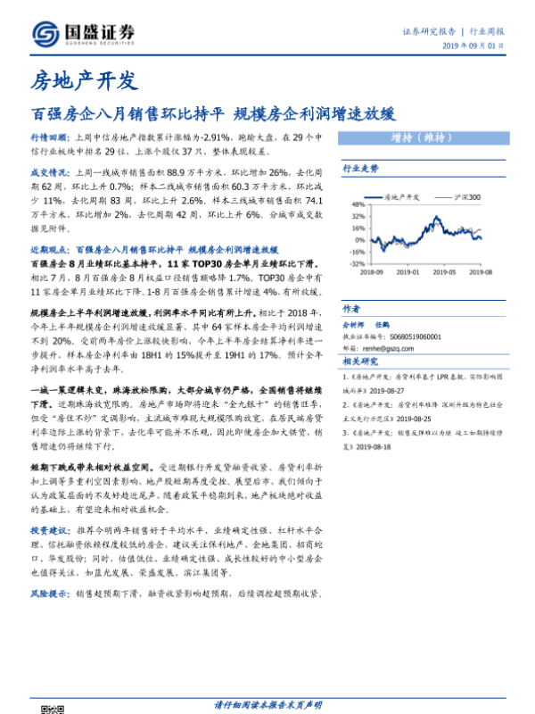 【国盛证券】【20190901】房地产开发行业周报:百强房企八月销售环比持平,规模房企利润增速放缓-12页