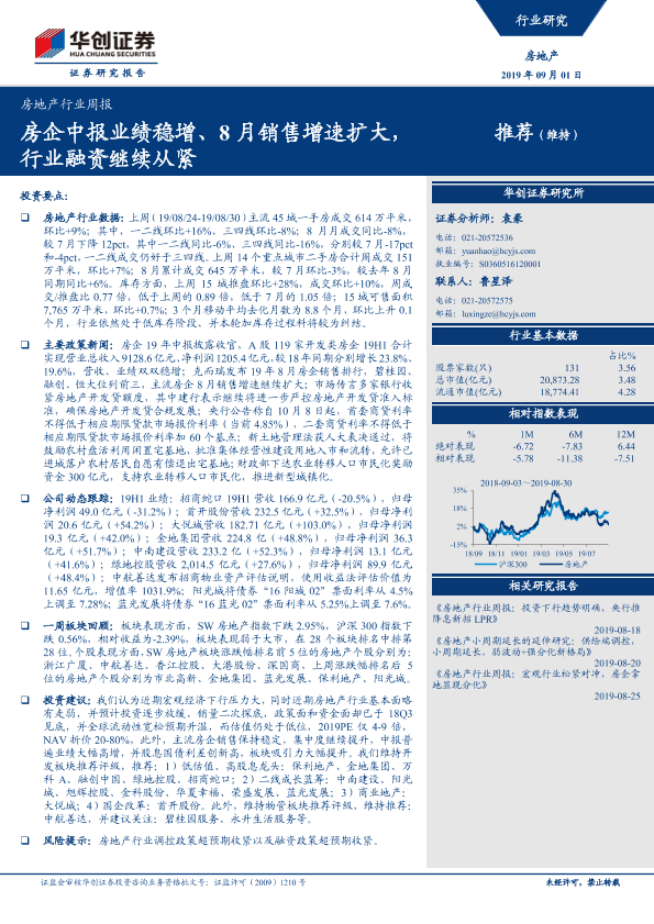 【华创证券】【20190901】房地产行业周报:房企中报业绩稳增、8月销售增速扩大,行业融资继续从紧-21页