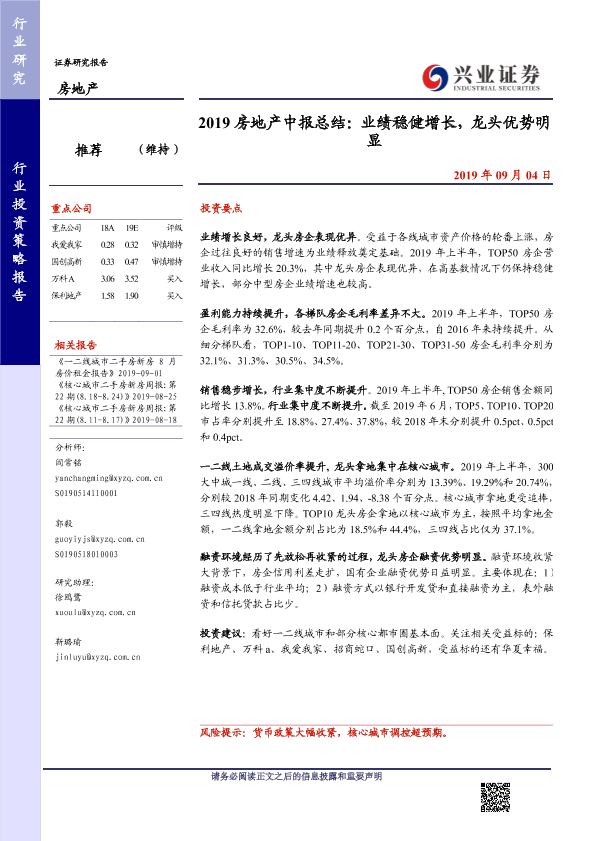 【兴业证券】【20190904】2019房地产中报总结:业绩稳健增长,龙头优势明显-10页