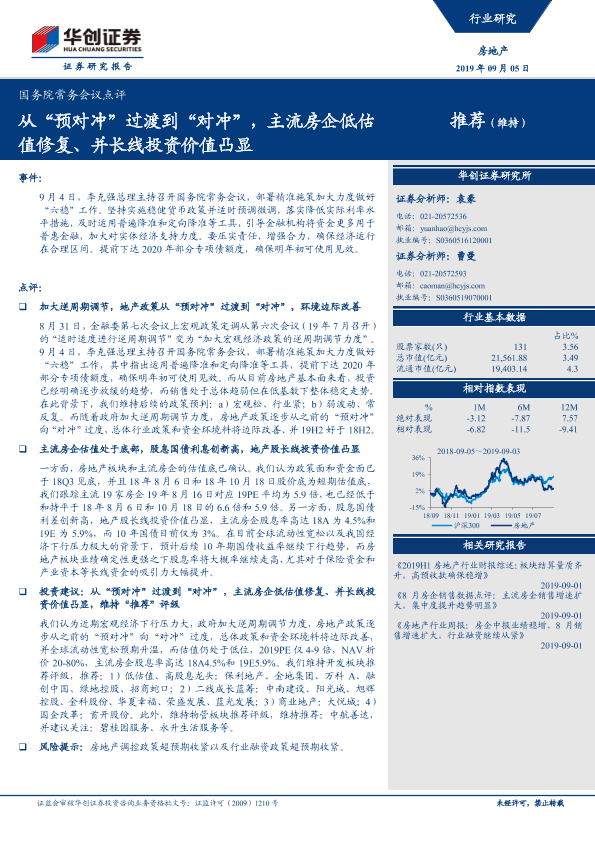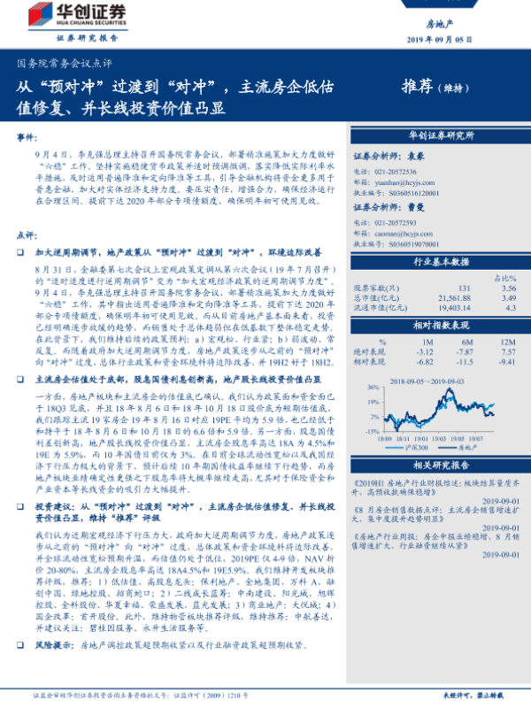 【华创证券】【20190905】国务院常务会议点评:从“预对冲”过渡到“对冲”,主流房企低估值修复、并长线投资价值凸显-5页