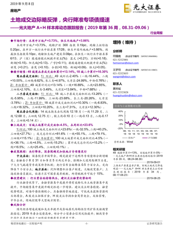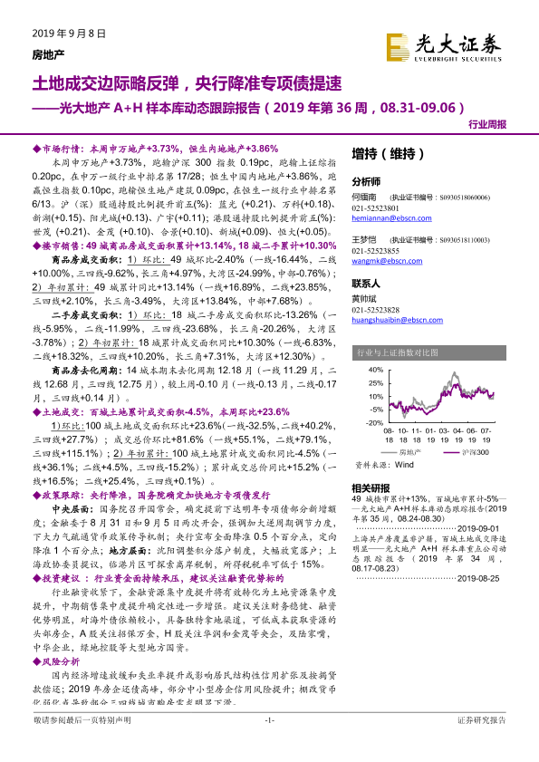 【光大证券】【20190908】光大地产A+H样本库动态跟踪报告:土地成交边际略反弹,央行降准专项债提速-14页