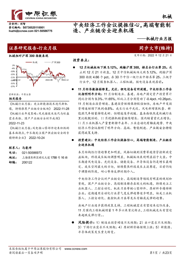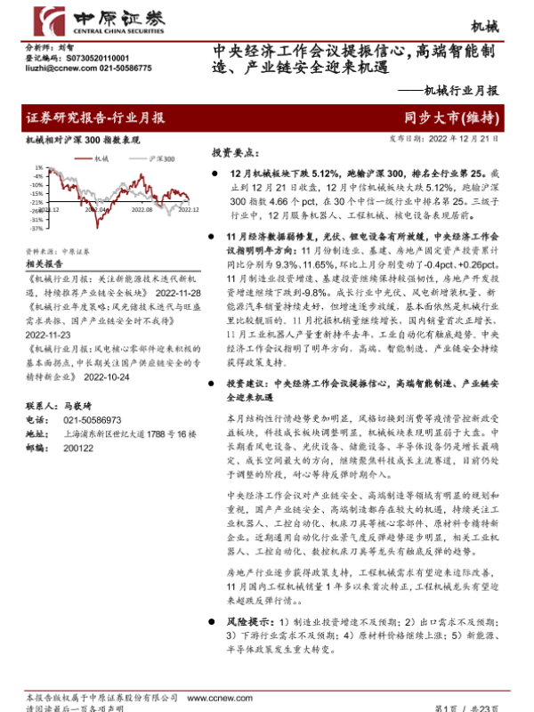 【中原证券】【20221221】机械行业月报:中央经济工作会议提振信心,高端智能制造、产业链安全迎来机遇-23页