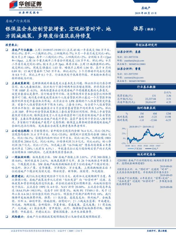 【华创证券】【20190915】房地产行业周报:银保监会未控制贷款增量,宏观松紧对冲、地方因城施策,多维度估值筑底待修复-21页