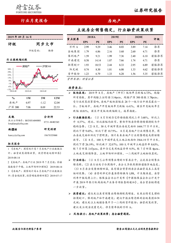 【财信证券】【20190916】主流房企销售稳定,行业融资政策收紧-13页