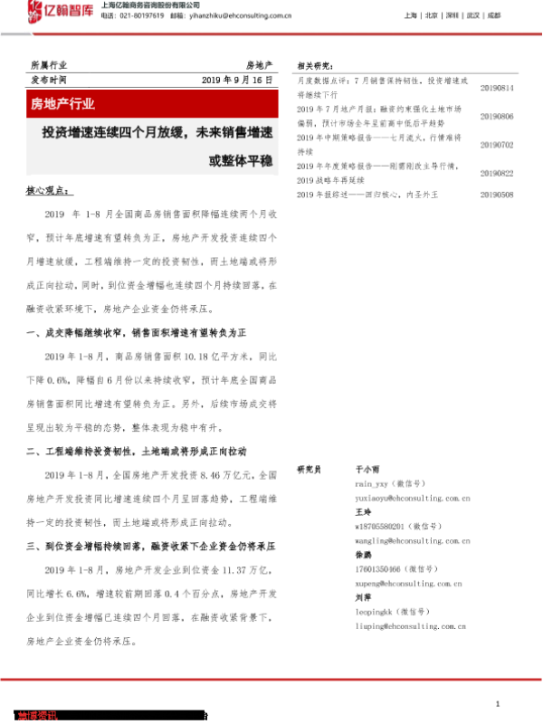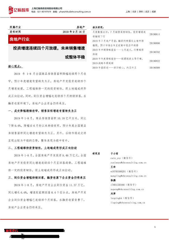 【亿翰智库】【20190916】房地产行业:投资增速连续四个月放缓,未来销售增速或整体平稳-9页