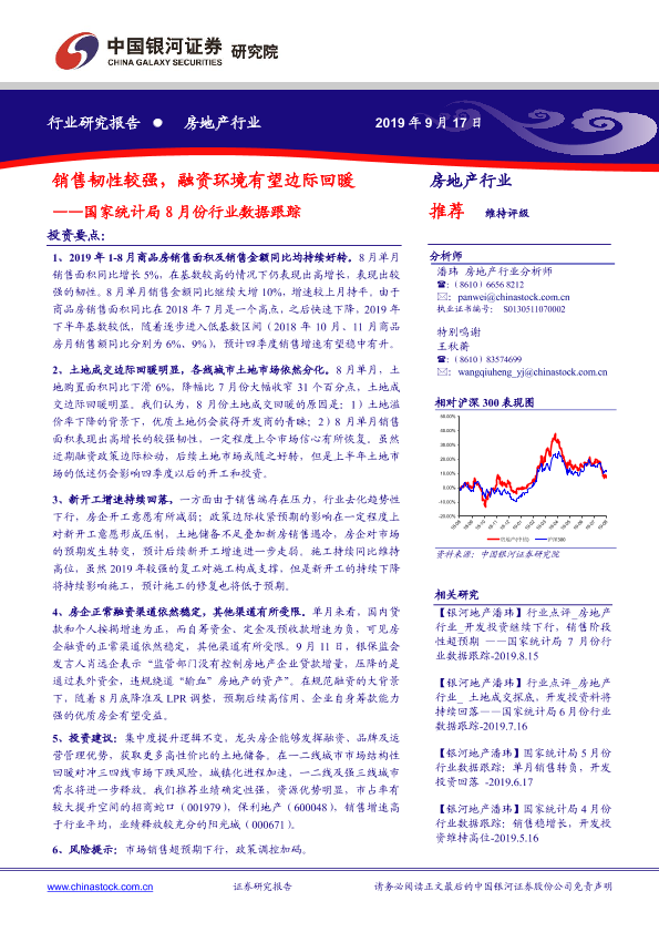 【银河证券】【20190917】房地产行业国家统计局8月份行业数据跟踪:销售韧性较强,融资环境有望边际回暖-11页