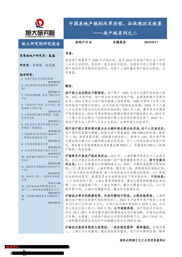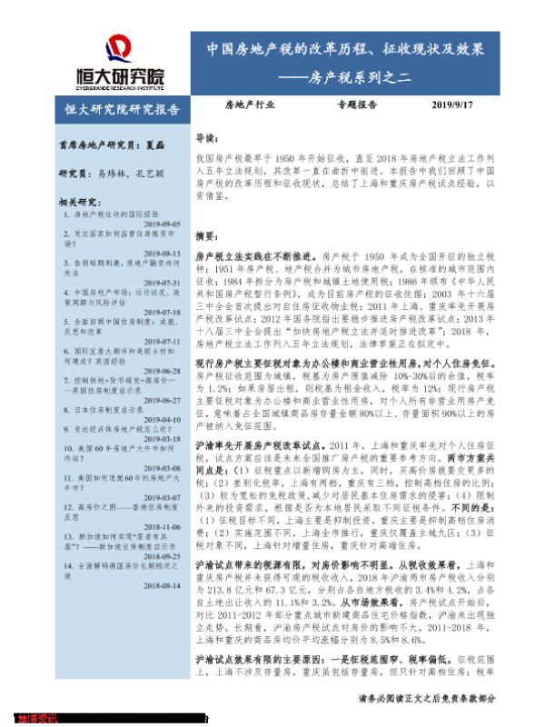 【恒大研究院】【20190917】中国房地产税的改革历程、征收现状及效果-12页