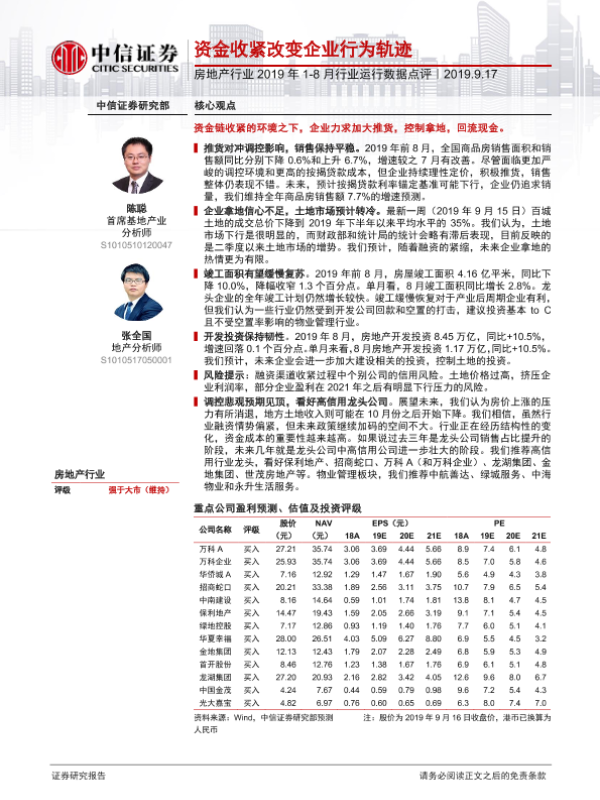 【中信证券】【20190917】房地产行业2019年1-8月行业运行数据点评-10页