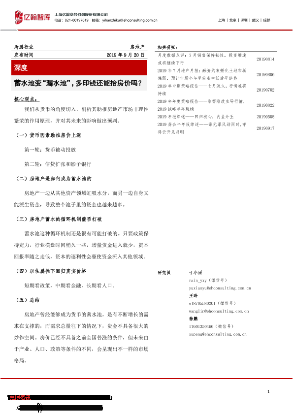 【上海亿翰商务咨询股份有限公司】【20190920】蓄水池变“漏水池”,多印钱还能抬房价吗?-8页
