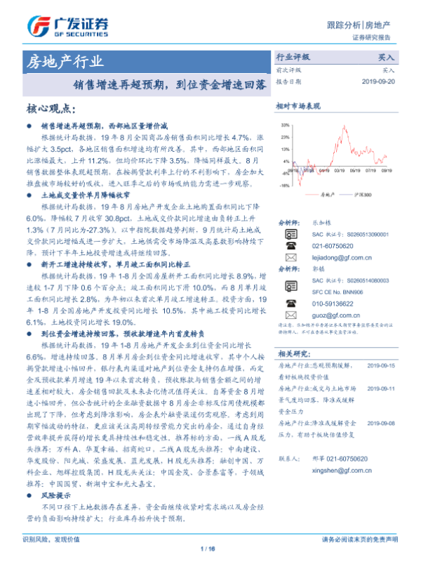 【广发证券】【20190920】房地产行业:销售增速再超预期,到位资金增速回落-16页