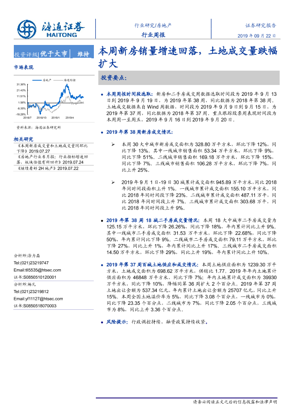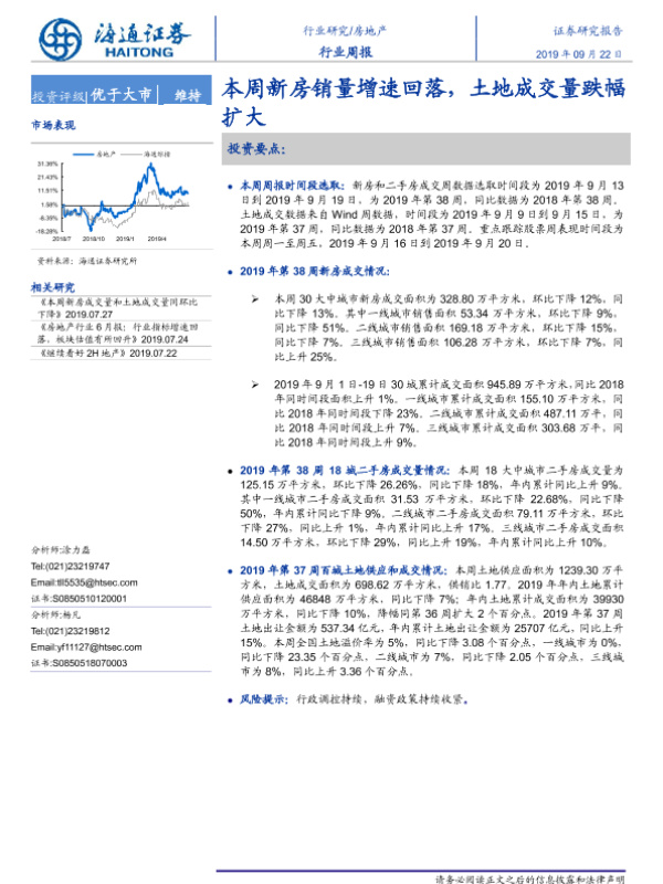 【海通证券】【20190922】房地产行业周报:本周新房销量增速回落,土地成交量跌幅扩大-6页