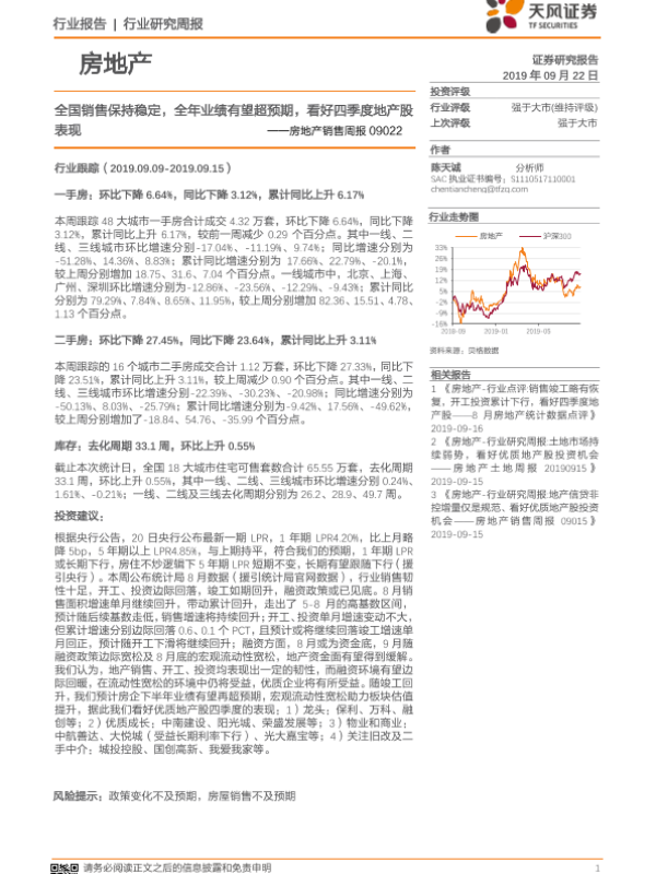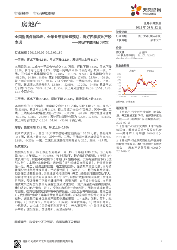【天风证券】【20190922】全国销售保持稳定,全年业绩有望超预期,看好四季度地产股表现-13页
