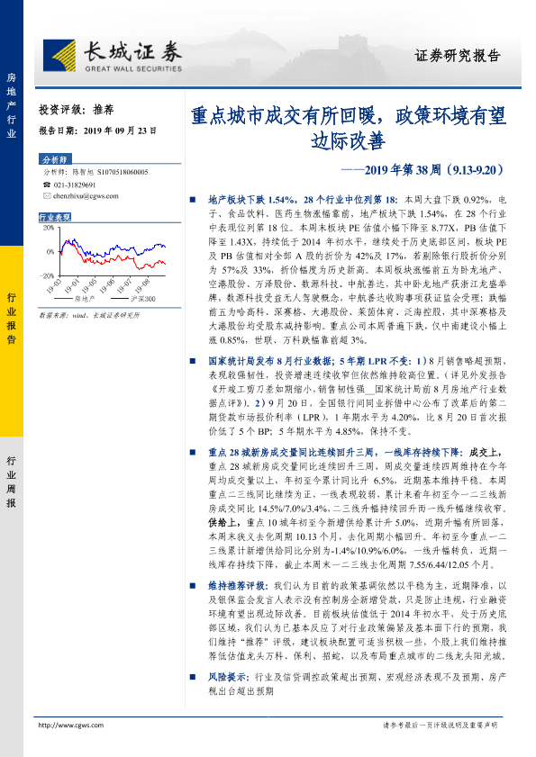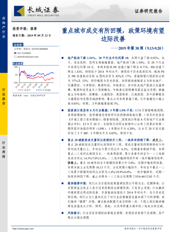 【长城证券】【20190923】房地产行业2019年第38周:重点城市成交有所回暖,政策环境有望边际改善-14页