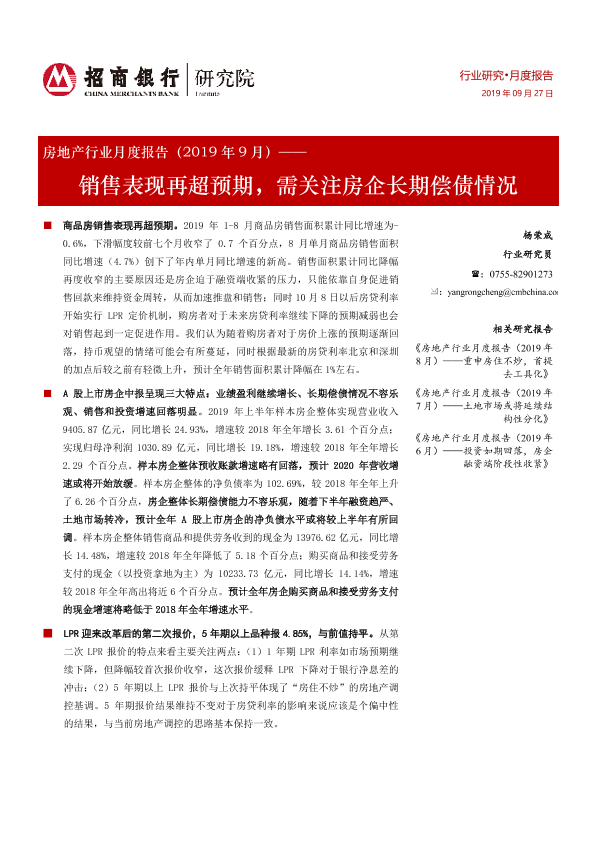 【招商银行】【20190927】房地产行业月度报告:销售表现再超预期,需关注房企长期偿债情况-22页