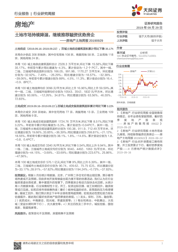 【天风证券】【20190929】房地产土地周报:土地市场持续降温,继续推荐融资优势房企-8页