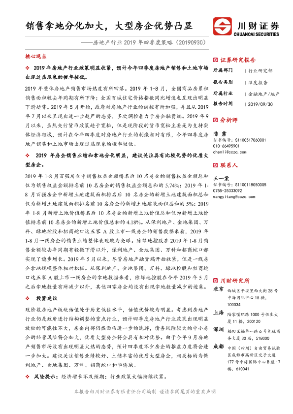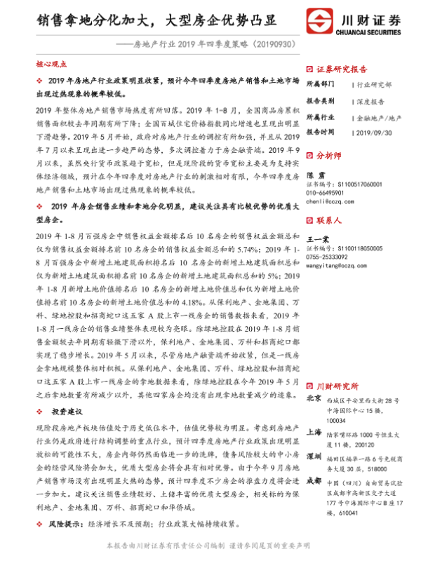 【川财证券】【20190930】房地产行业2019年四季度策略:销售拿地分化加大,大型房企优势凸显-19页