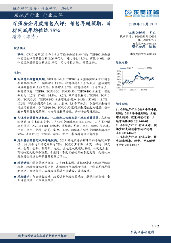 【东吴证券】【20191007】房地产行业点评:百强房企月度销售点评:销售再超预期,目标完成率均值达75%-2页