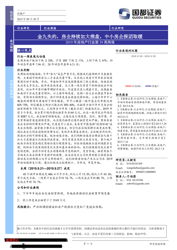 【国都证券】【20190930】2019年房地产行业第39周周报:金九失约,房企持续加大推盘,中小房企报团取暖-18页