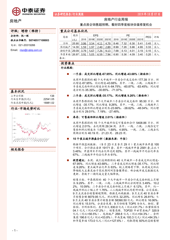 【中泰证券】【20191007】房地产行业周报:重点房企销售超预期,看好四季度板块估值修复机会-17页