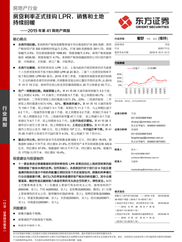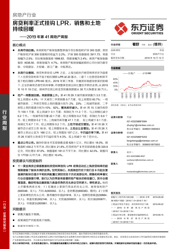 【东方证券】【20191012】2019年第41周地产周报:房贷利率正式挂钩LPR,销售和土地持续回暖-18页