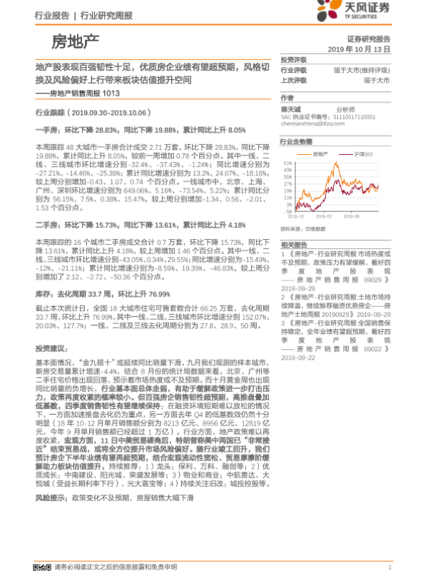 【天风证券】【20191013】地产股表现百强韧性十足,优质房企业绩有望超预期,风格切换及风险偏好上行带来板块估值提升空间-13页