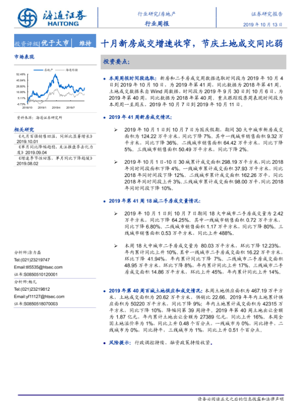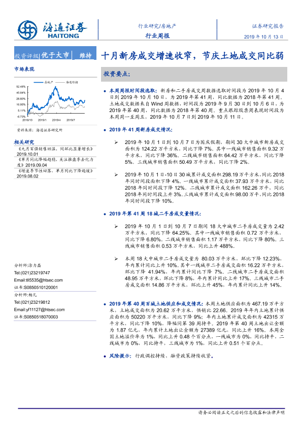【海通证券】【20191013】房地产行业周报:十月新房成交增速收窄,节庆土地成交同比弱-6页