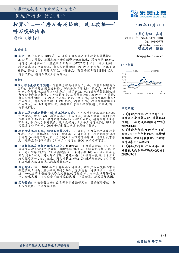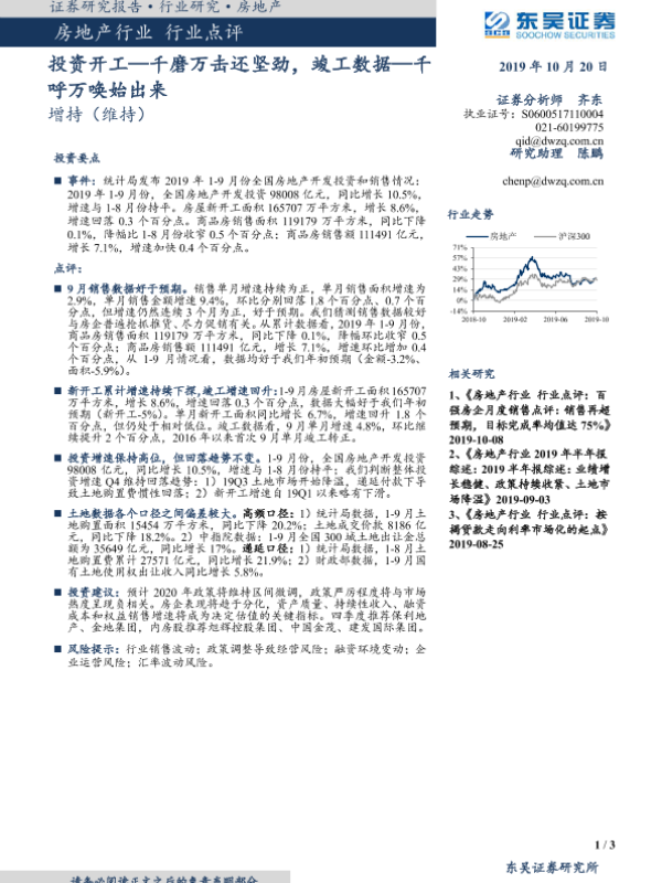 【东吴证券】【20191020】房地产行业行业点评:投资开工—千磨万击还坚劲,竣工数据—千呼万唤始出来-3页