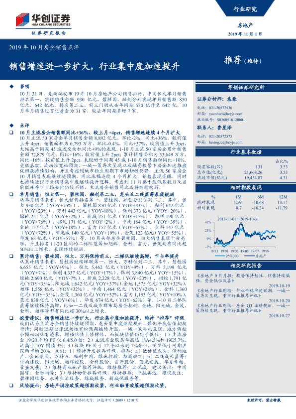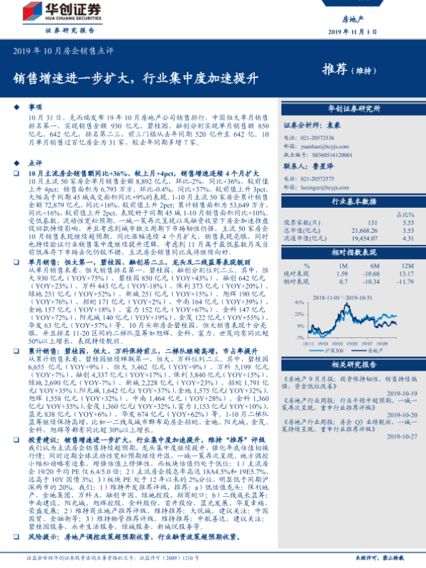 【华创证券】【20191101】2019年10月房企销售点评:销售增速进一步扩大,行业集中度加速提升-11页