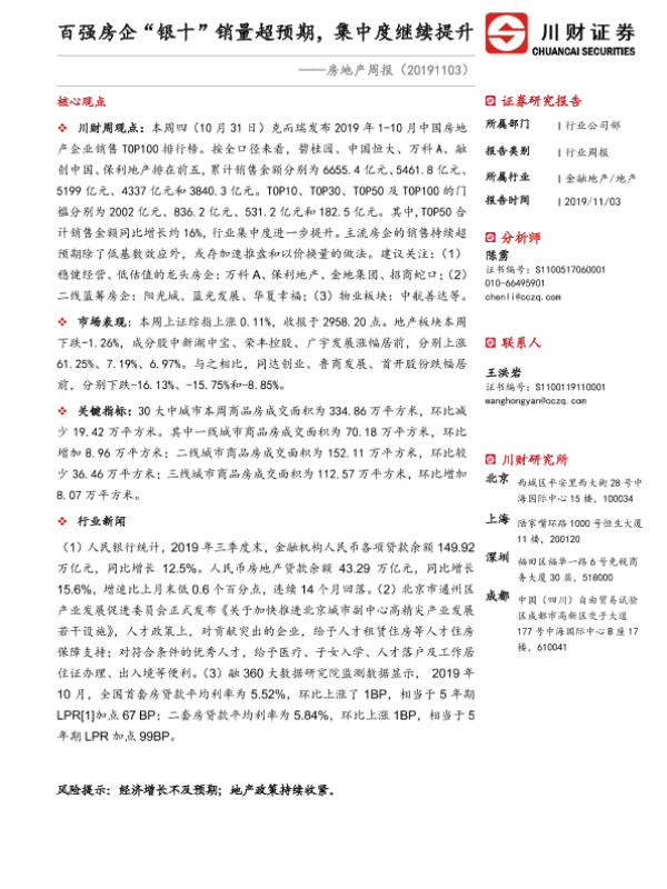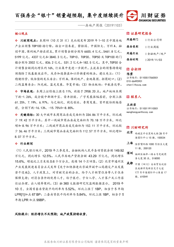 【川财证券】【20191103】房地产周报:百强房企“银十”销量超预期,集中度继续提升-10页