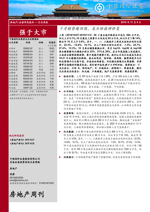 【中银证券】【20191104】房地产行业周报:十月销售超预期,龙头估值待修复-16页