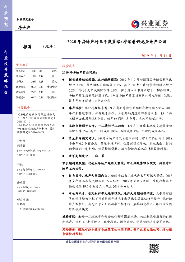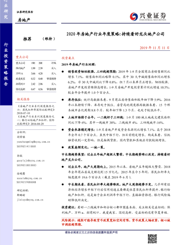 【兴业证券】【20191111】2020年房地产行业年度策略 持续看好龙头地产公司-23页