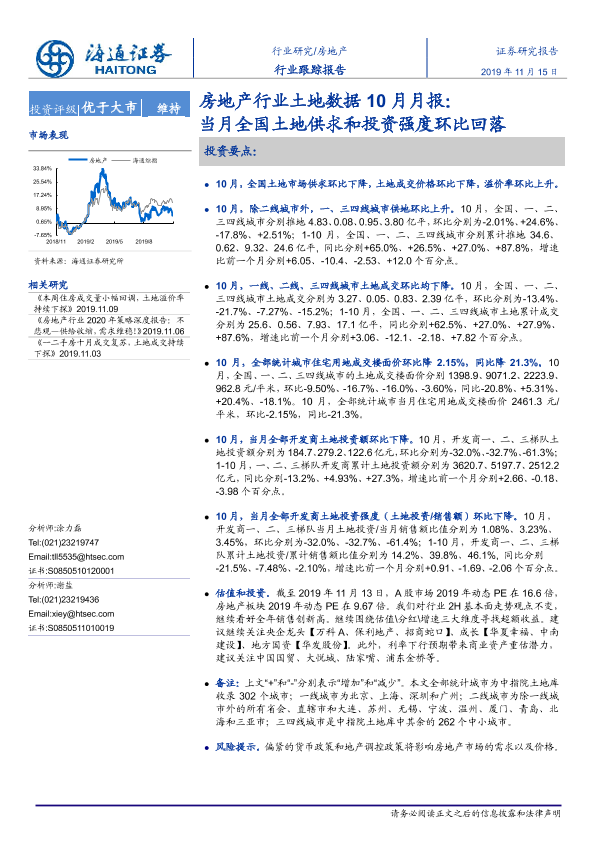 【海通证券】【20191115】房地产行业土地数据10月月报:当月全国土地供求和投资强度环比回落-9页